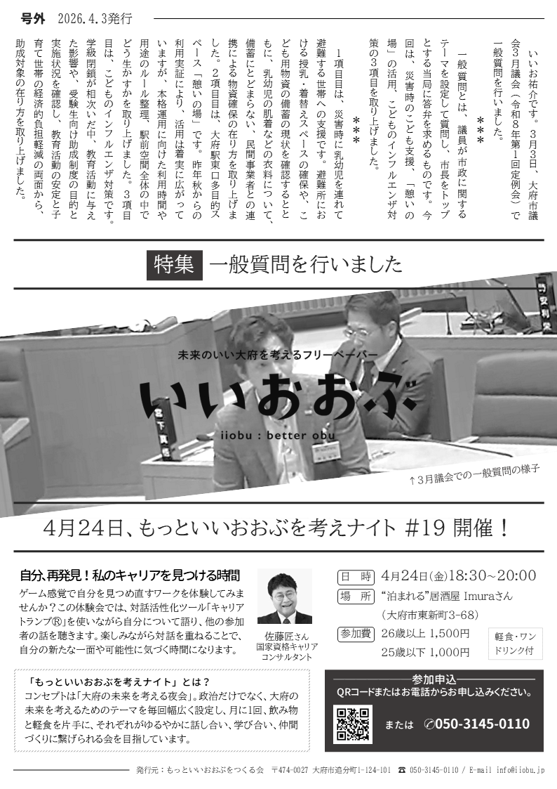 大府市議会議員のいいお祐介です。本記事では、朝の駅頭活動で配布している活動報告「いいおおぶ」の号外(2026年4月3日発行)を掲載します。今回の紙面では、3月議会で行った一般質問について、災害時のこども支援、大府駅東口多目的スペース「憩いの場」の活用、こどものインフルエンザ対策の3項目をまとめています。あわせて、4月24日に開催する「もっといいおおぶを考えナイト #19」についても掲載してい...